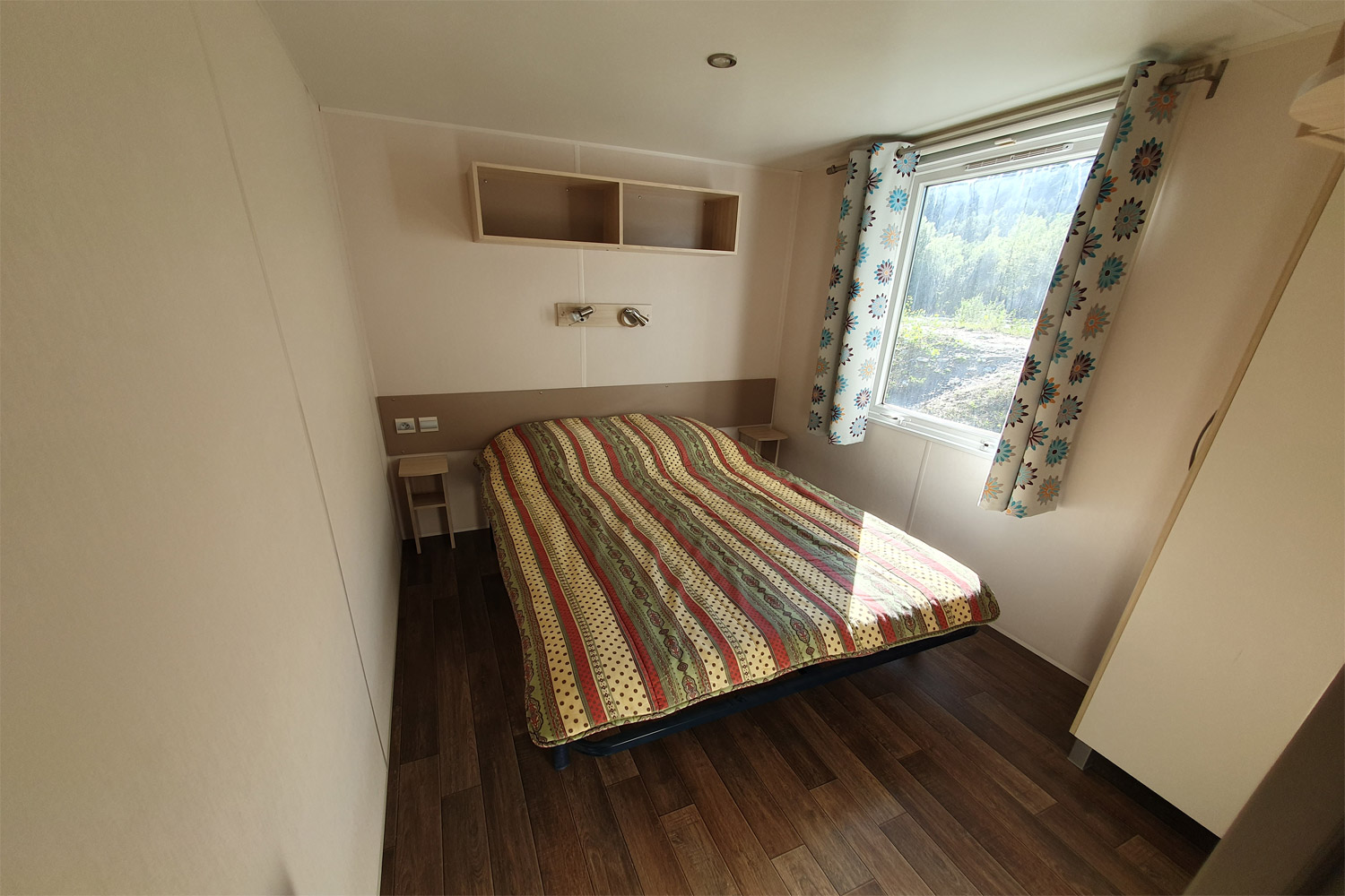 - Une chambre avec un lit double (140 x 190 cm), penderie et placard (possibilité d’y ajouter un lit parapluie)
