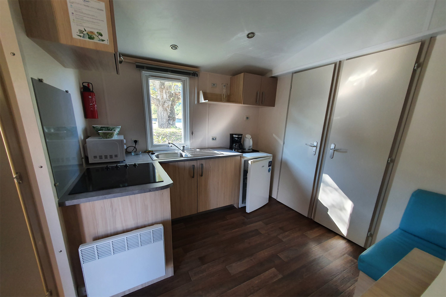 - Une cuisine / séjour équipée (réfrigérateur, four micro-ondes, plaque de cuisson électrique, batterie de cuisine complète, cafetière électrique, bouilloire, vaisselle)